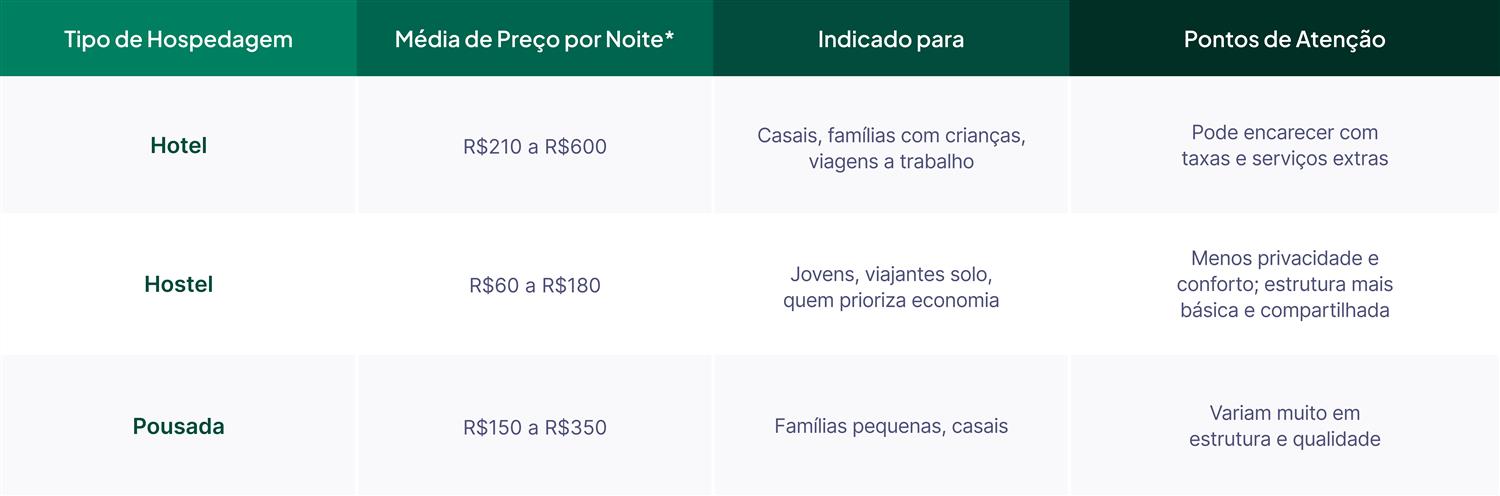 *Valores médios com base em plataformas como Booking, AirBnb e Hurb, considerando alta temporada 2025.