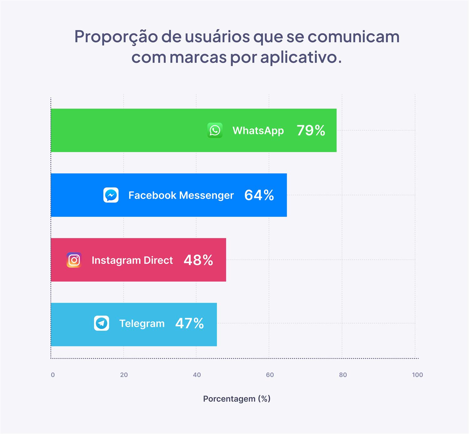 De acordo com a pesquisa Panorama Mobile Time/Opinion Box (2024), 79% dos usuários afirmam se comunicar com marcas pelo WhatsApp, tornando-o o canal preferido de atendimento e relacionamento com empresas — à frente do Facebook Messenger (64%) e do Instagram Direct (48%).